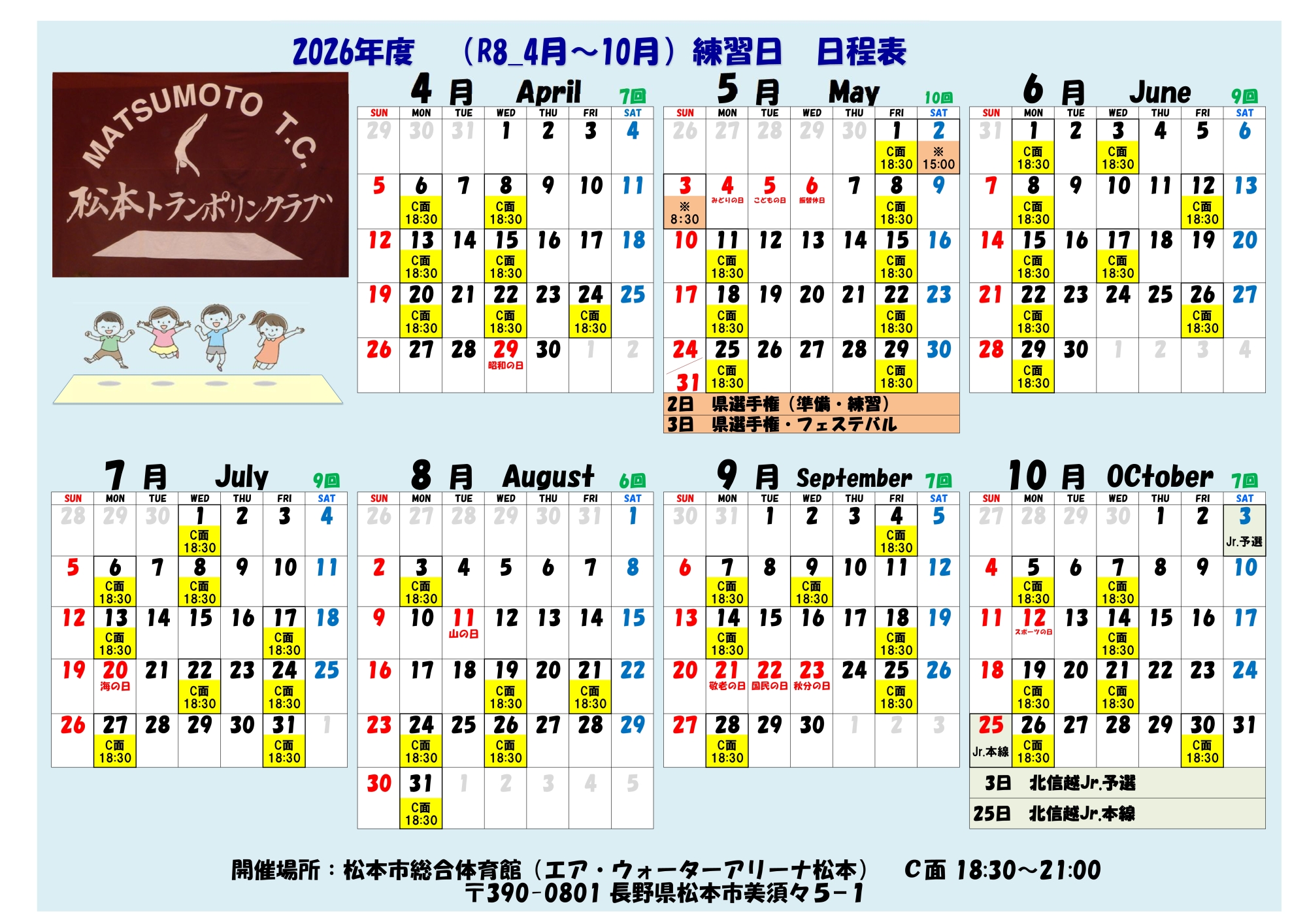 練習日については、 日程カレンダーのご確認を お願いします。
